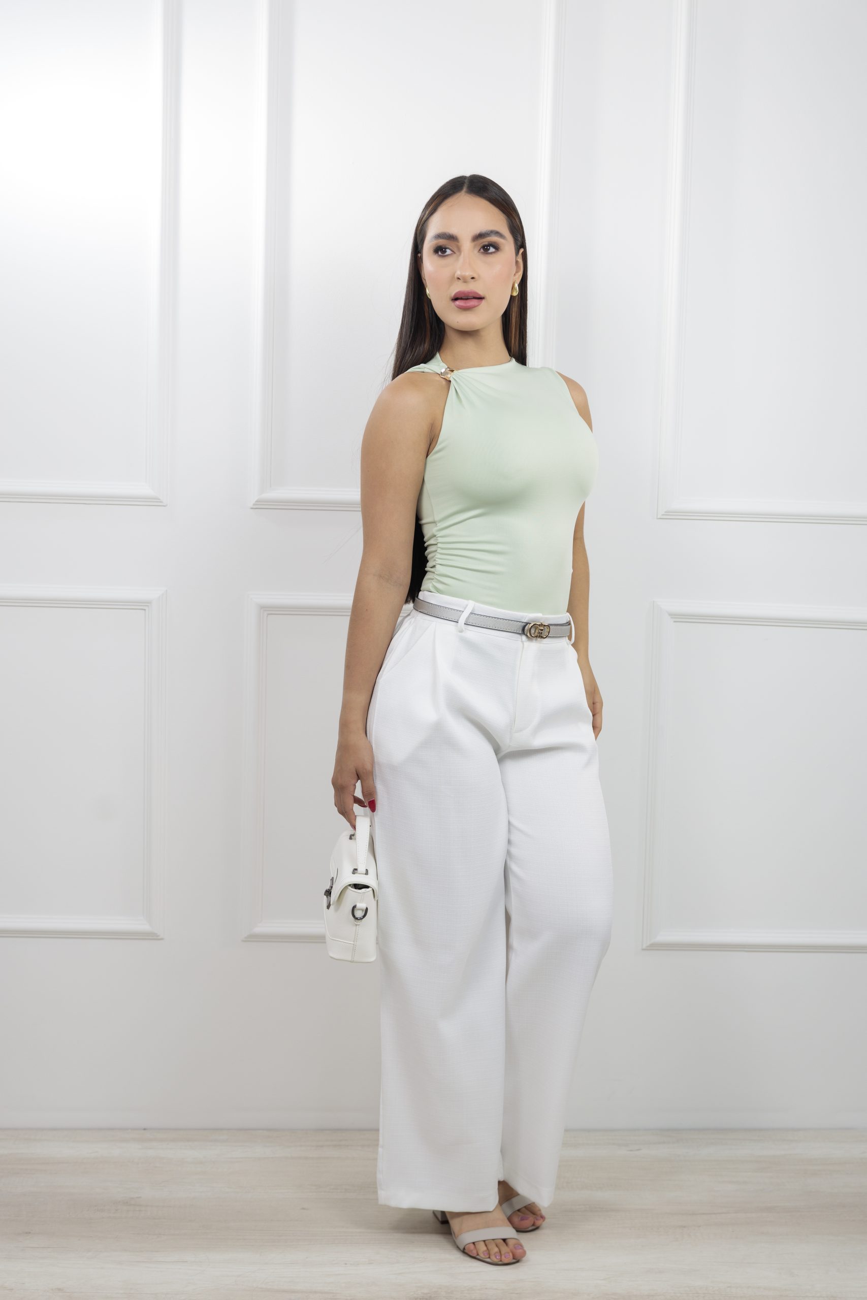 Blusa femenina sin mangas con cuello alto y detalle metálico decorativo en el hombro que aporta un estilo elegante y moderno. Su diseño ajustado estiliza la silueta y permite combinarla fácilmente con jeans, pantalones o faldas para crear looks sofisticados.