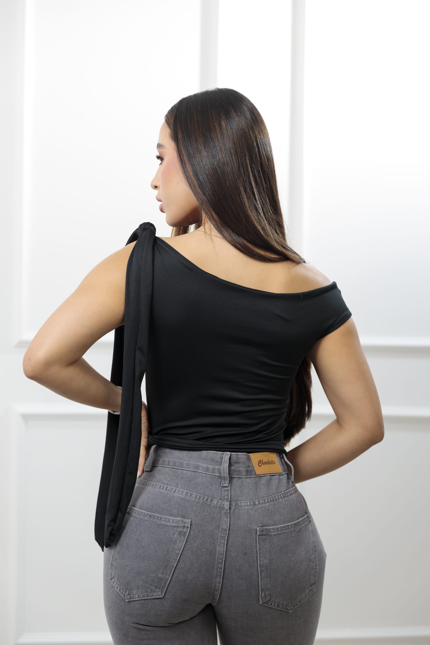 Blusa femenina de diseño off shoulder con detalle metálico decorativo y lazo lateral que aporta un estilo elegante y moderno. Su ajuste al cuerpo resalta la silueta y la convierte en una prenda ideal para looks sofisticados o casuales.