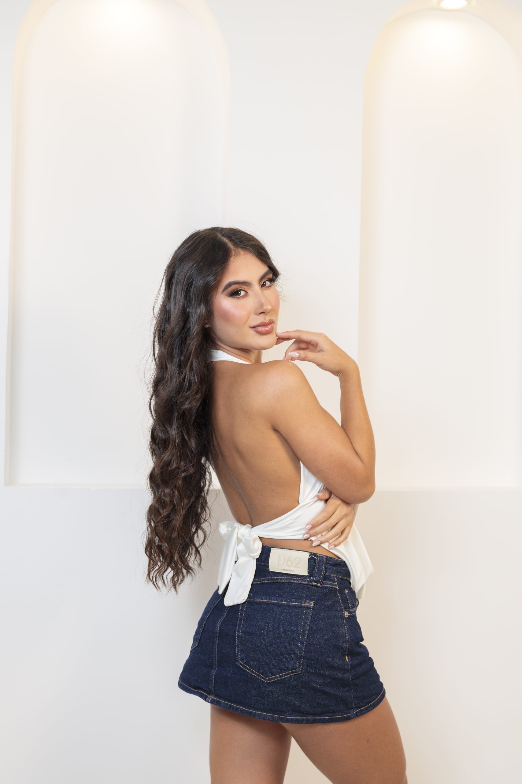 Blusa tipo halter con escote profundo y detalle de herraje frontal que realza la figura. Confeccionada en tela destellante con caída fluida, ideal para looks llamativos y elegantes.