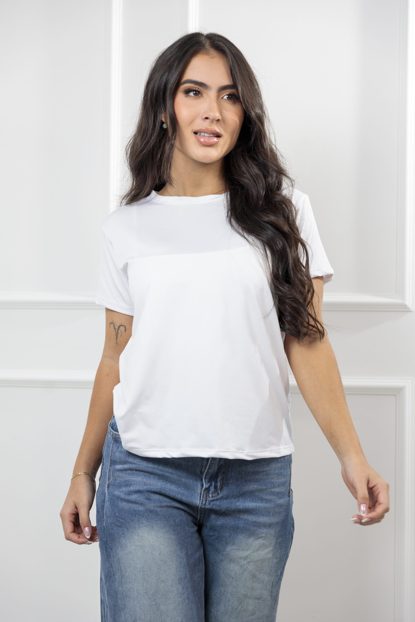 Camiseta femenina básica de manga corta con cuello redondo y diseño minimalista. Su silueta recta y tela suave la convierten en una prenda esencial para looks casuales, urbanos y fáciles de combinar.