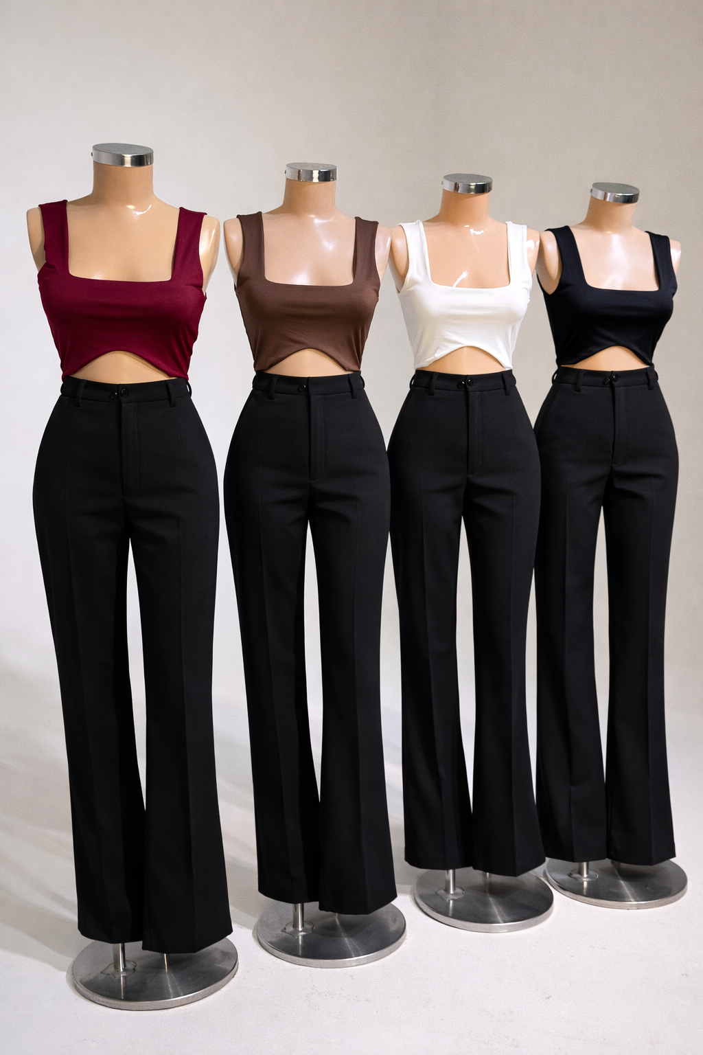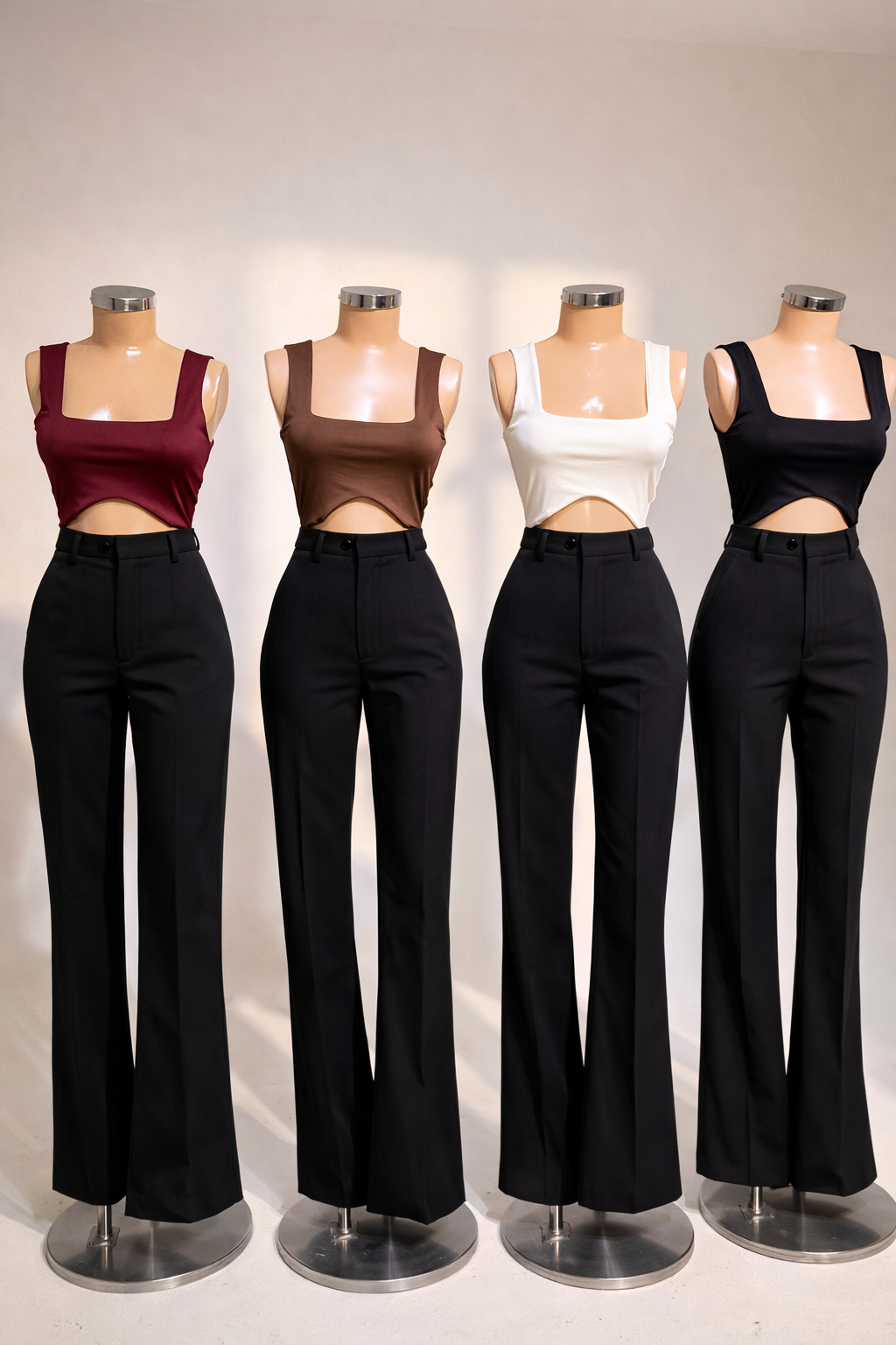 Crop top femenino de diseño ajustado con escote recto y tiras anchas. Presenta un corte inferior curvo que aporta un detalle estructural y estiliza la silueta. Confeccionado en tela suave de acabado limpio.