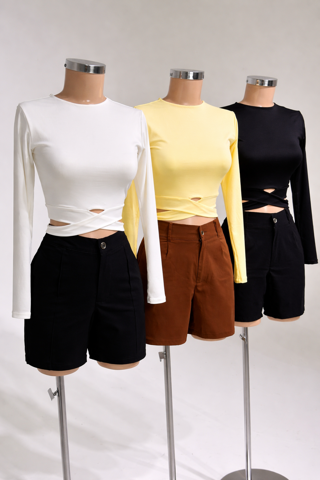 Crop top femenino de manga larga con diseño cruzado en la parte inferior y sutiles aberturas que realzan la figura. Ajuste cómodo y moderno, ideal para looks en tendencia.
