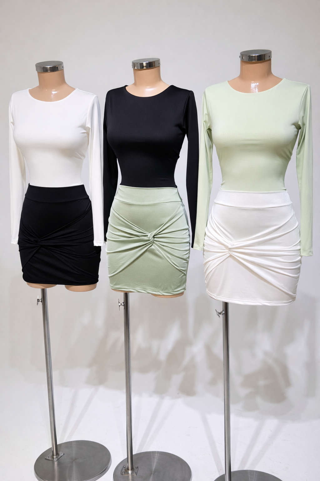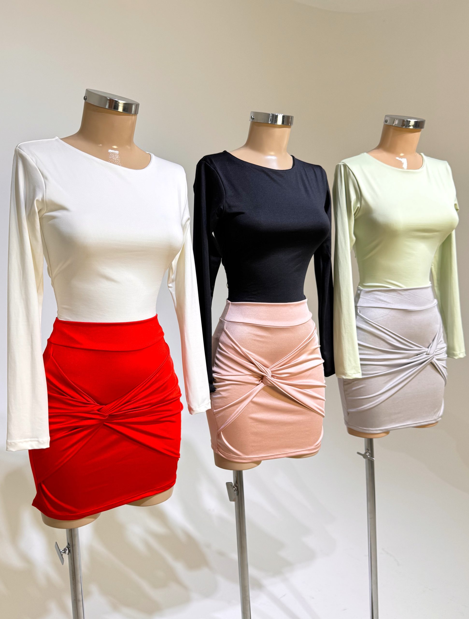 Falda corta con diseño drapeado y nudo frontal que estiliza la silueta. Confeccionada en tela destellante que aporta brillo y un acabado llamativo, ideal para looks en tendencia.