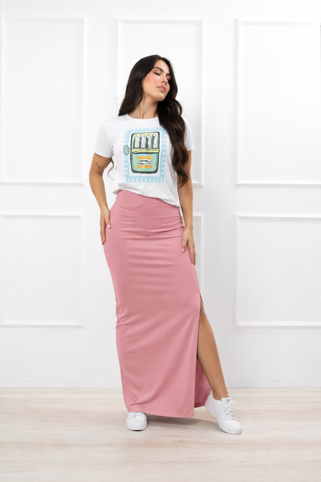 Falda Larga femenina de ajuste ceñido, con diseño fruncido lateral y detalle metálico decorativo que aporta estructura al modelo. Prenda de acabado limpio y silueta estilizada.