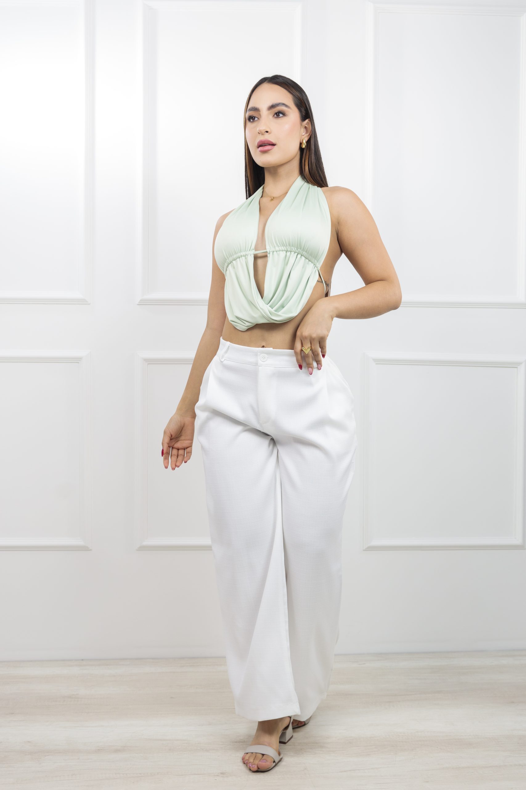 Pantalón femenino de tiro alto con diseño de bota amplia que estiliza la silueta y brinda comodidad. Ideal para looks elegantes, casuales o formales.