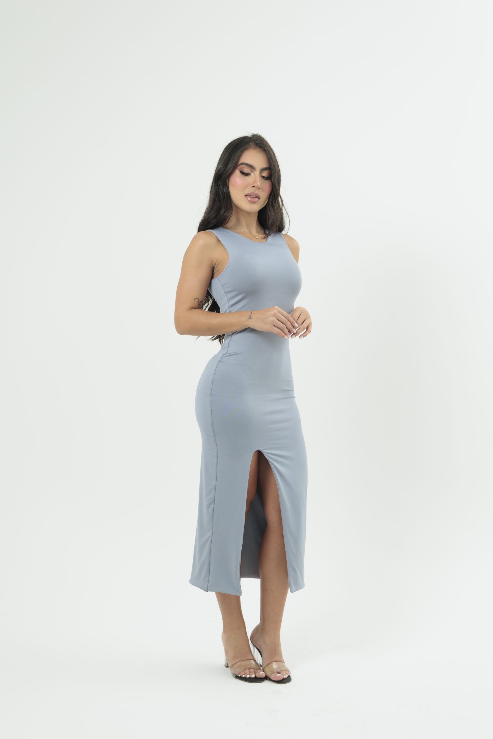 Vestido femenino corto de cuello alto y diseño sin mangas que estiliza la figura con un look moderno y elegante. Su ajuste al cuerpo y tela suave brindan comodidad y una silueta femenina ideal para diferentes ocasiones.