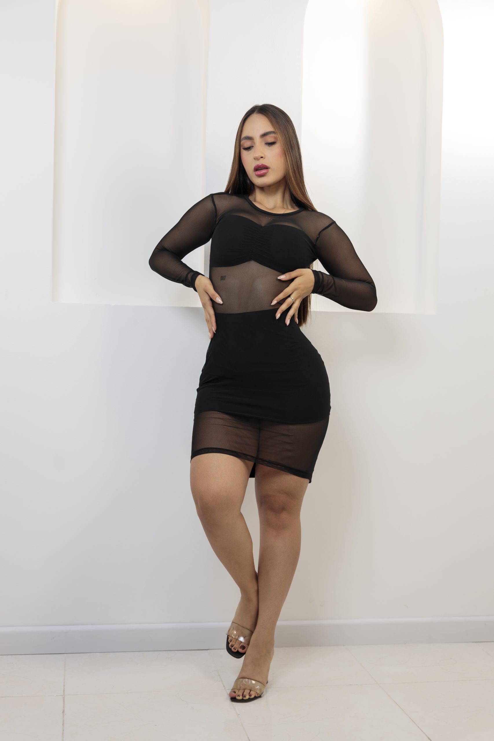 Vestido corto femenino con diseño en malla transparente y body interno que resalta la silueta. Su combinación de texturas crea un look sensual, moderno y perfecto para ocasiones especiales.